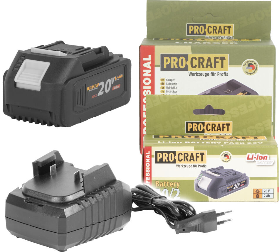 Sada obsahuje jednu baterie Procraft 20V 4Ah s ochranou proti přehřátí a vybití a nabíječku. Ideální doplněk pro nepřerušovanou práci s aku nářadím Procraft.