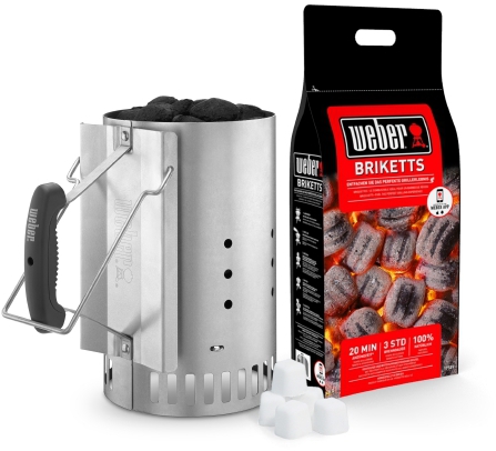 Zapalovací set s Weber® Rapidfire® zapalovacím komínem, 2 kg nových briket Weber® a 6 ks podpalovacích kostek.