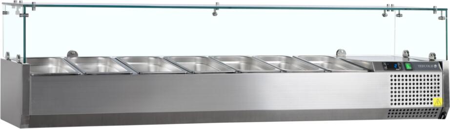 nerezová ocel|statické chlazení|skleněné krytí na ochranu potravin|nastavitelné nožky|přizpůsobeno GN1/3 (nejsou součástí balení)