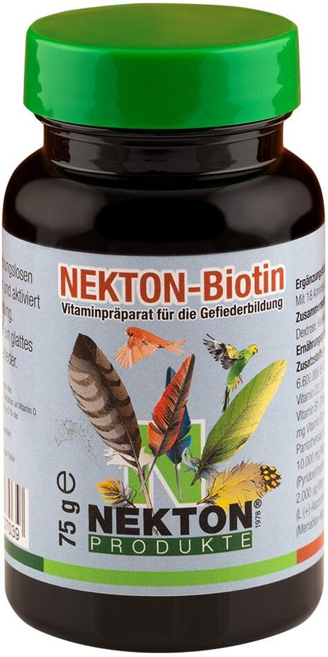 NEKTON Biotin podporuje hladký proces přepeřování a růst nového peří. Obsahuje všechny esenciální vitamíny, minerály, stopové prvky, aminokyseliny a navíc 200.000 µg/kg biotinu. NEKTON Biotin dává ptákům možnost růstu nádherného a zdravého peří.