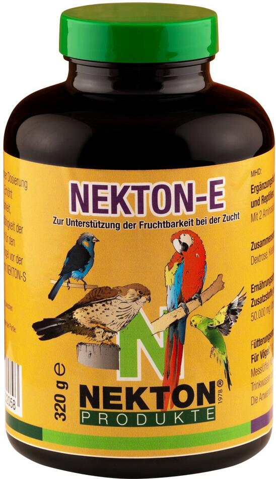 NEKTON-E v podobě rozpustného prášku poskytuje chovatelům ideální formu pro dávkování. Stačí jej přidávat do měkkého krmiva nebo vody. Po přidání do studené vody může NEKTON-E tvořit mléčnou, kalnou substanci. Toto je naprosto v pořádku, stejně tak jako usazeniny na okrajích nádoby. Jedná se pouze o substanci, nesoucí přídavné látky. Vitaminy jsou kompletně rozpustné. Ideální je kombinace s NEKTON S.Používejte NEKTON E cca 3 týdny před začátkem chovné sezóny a přestaňte jej ptákům nabízet, jakmile se objeví první snůšky.