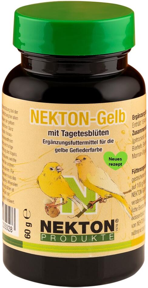 Potravní doplněk pro podporu růstu peří a zvýraznění jeho žluté barvy u všech druhů ptáků. Zabraňuje blednutí žlutého peří, zintenzivňuje jeho zářivost a plný odstín. NEKTON-Gelb obsahuje 18 aminokyselin, které napomáhají při tvorbě a růstu nového peří během období přepeřování. Pro ideální a vyváženou krmnou dávku doporučujeme kombinaci s NEKTON-S a NEKTON-Biotin.