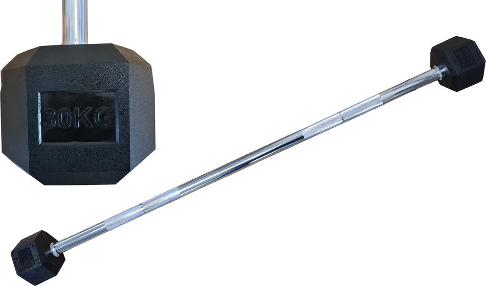 Obouruční pogumovaná hexagonální činka rovná s odolným pogumovaným povrchem. Díky svéme šestihrannému tvaru znemožňuje odkutálení činky při manipulaci. Dálší výhodou je pogumovaný povrch, který zaručuje menší hlučnost při odkládání a manipulací. Činka má hřídel s drobnými výstupky proti prokluzování umožňující pevnější a pohodlnější úchop.