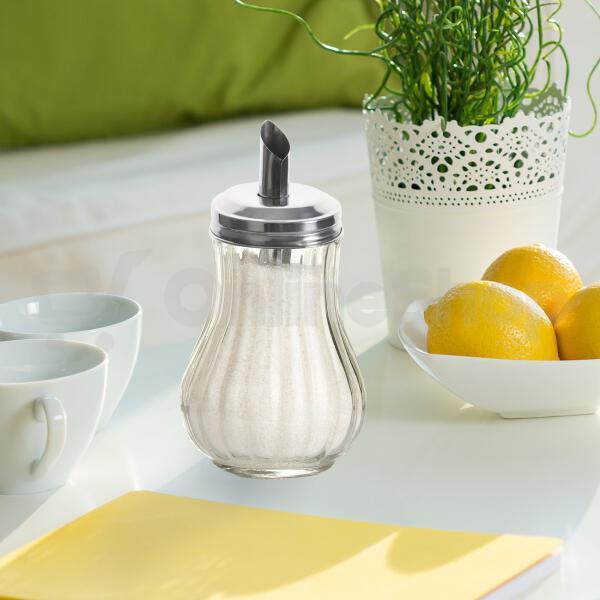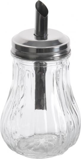 Cukřenka s dávkovačem. Materiál: sklo. Rozměry: pr. 7 cm, v. 13,5 cm.