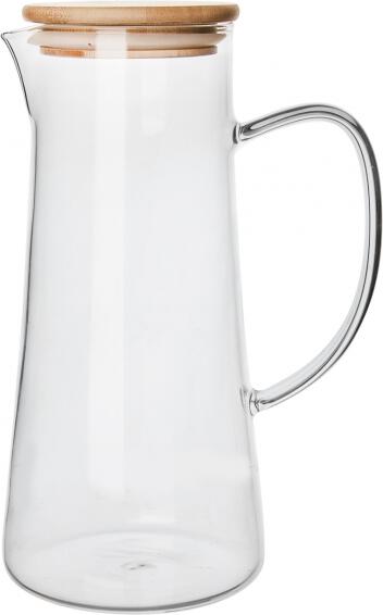 Džbán s uchem, výlevkou a s víčkem Džbán se výborně hodí na letní osvěžující nápoje, ale je skvělý i na přípravu a servírování horkého čaje, svařeného vína. Praktické víko také zabraňuje vnějšímu znečištění nápoje a umožňuje jeho dlouhodobější uchovávání. Víčko je opatřeno silikonovým těsněním. Materiál: borosilikátové sklo (varné – snáší teploty – 20 °C až 230 °C), bambus, silikon. Rozměry: objem 1,5 l, pr.11 cm, v. 24 cm. Lze mýt v myčce na nádobí i použít v MVT (bez víčka). Lze použít bez víčka na elektrické i sklokeramické desce, na plynovém sporáku doporučujeme použít rozptylovač plamene.