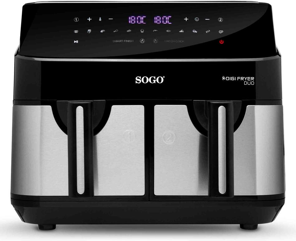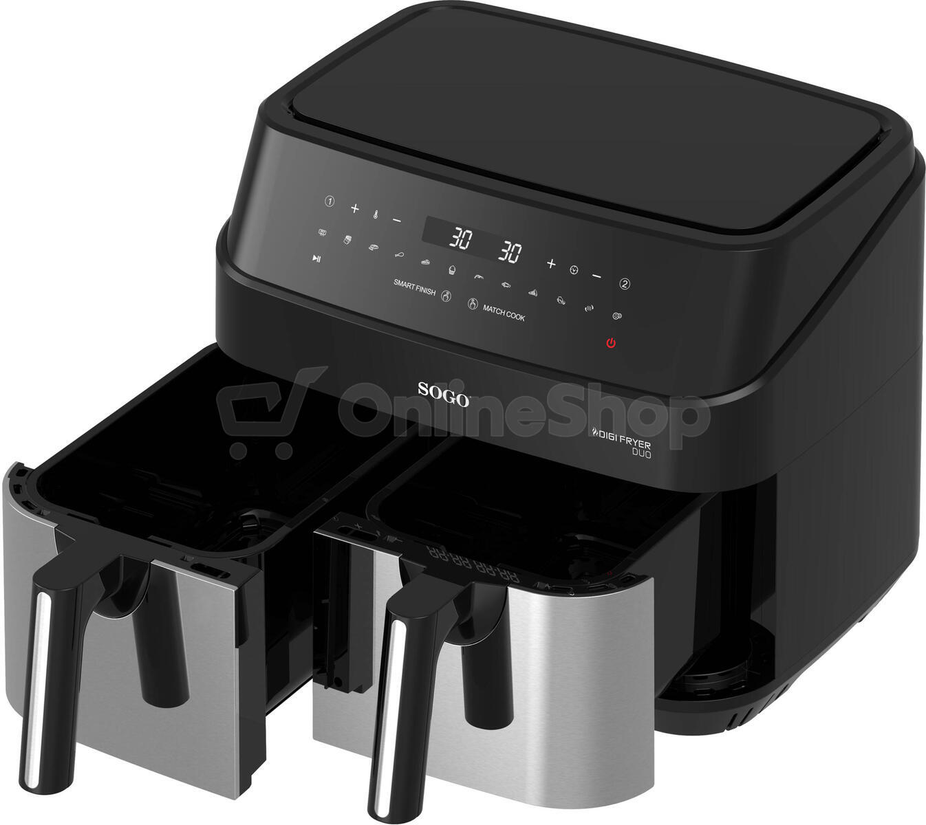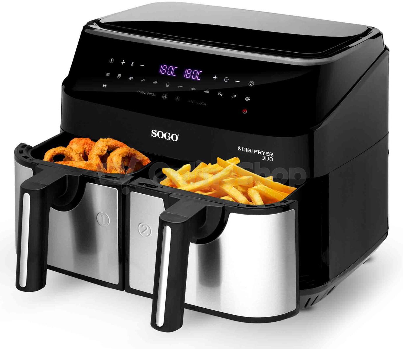 Chytrá, multifunkční a dvojtá horkovzdušná fritéza. 2 fritovací koše - celková kapacita 9 l (2x 4,5 l). Samostatné ovládání pro každy koš a možnost vařit 2 jidla najednou - technologie Smart finish