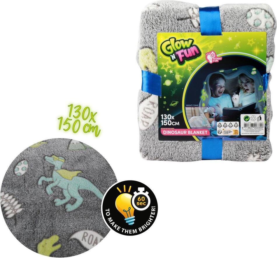 Nádherná plyšová deka o rozměrech 130 x 150 cm. Pro nasvícení stačí pouhých 60 vteřin pod světlem, ovšem čím bude světlo intenzivnější, tím více a déle bude produkt ve tmě svítit. Doporučujeme nechat na světle „nasvítit“ co nejdéle, minimálně však 10 minut. Deku zdobí spousta malých i velkých postaviček dinosaurů, které ve tmě opravdu svítí, takže vašim večerům i nocím dodají dokonalé romantické kouzlo.