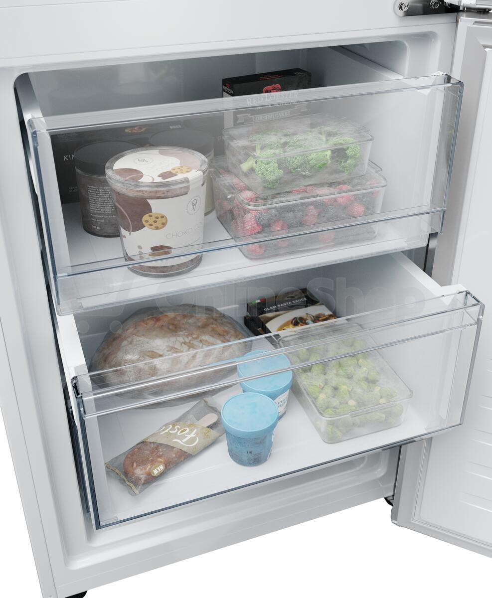 Chladnička - kombinovaná chladnička, volně stojící, mrazák dole, energetická třída A, hlučnost 35 db, objem 409 l, mrazák, Total No Frost, SuperCool, LED osvětlení, Režim ECO, změna otevíraní dveří, alarm nedovřených dveří, displej, prázdninový režim, nulová zóna, chytrá domácnost, výška 205 cm, šířka 59,5 cm, hloubka 66,7 cm, bílá..