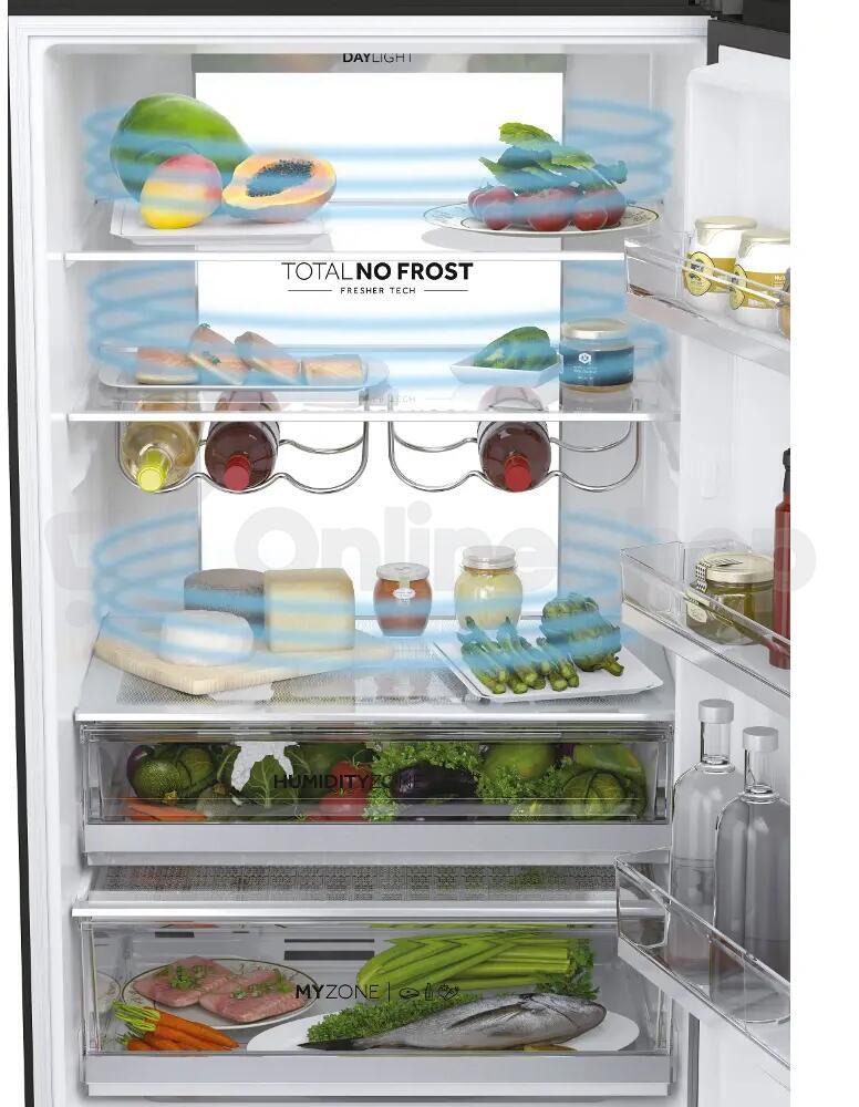 • Air Surround Total No Frost – beznámrazová technologie s rovnoměrnou distribucí chladného vzduchu proudícího v horizontálních kruzích; zachování až 99 % šťavnatosti a konzistence potravin