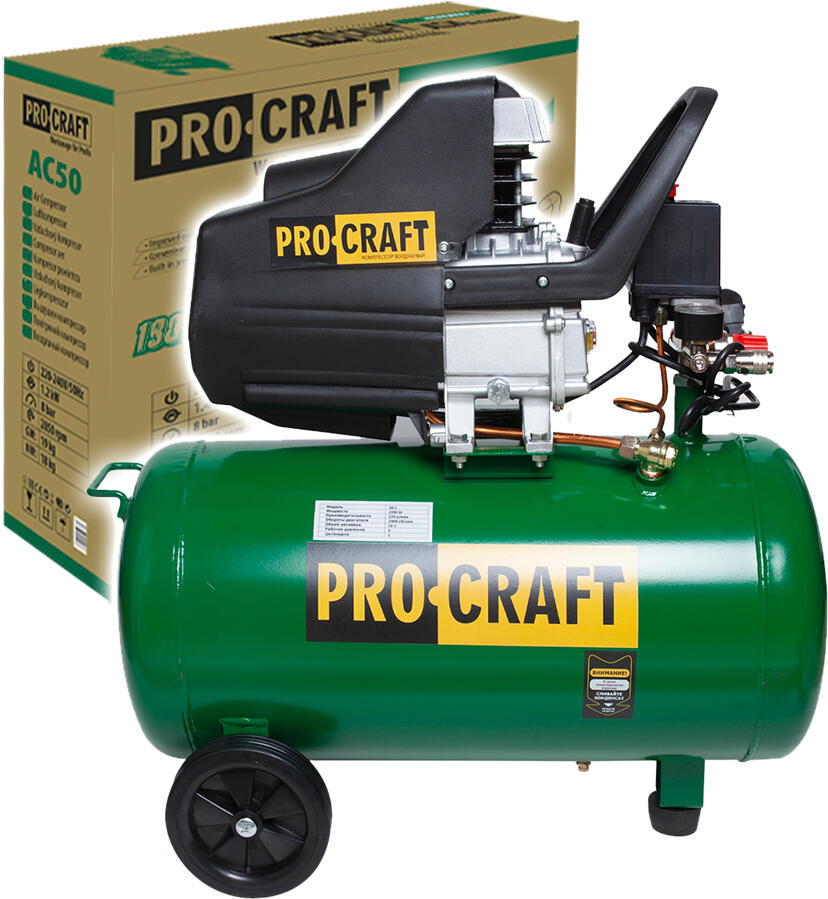 Kompresor Procraft AC50 je určen ke stlačení vzduchu pro provoz pneumatického nářadí, huštění pneumatik. Silný motor s výkonem 1400 W zaručuje vysoký sací výkon až 198 l/min. Mazání olejem zvyšuje životnost kompresoru, a optický ukazatel usnadňuje kontrolu jeho stavu. Regulace výše pracovního tlaku umožňuje nastavení optimálních parametrů podle zvoleného vzduchového nářadí. Rychlospojky vývodů usnadňují a zrychlují práce. Součástí dodávky jsou přepravní kola, pryžové botky. Balení karton.