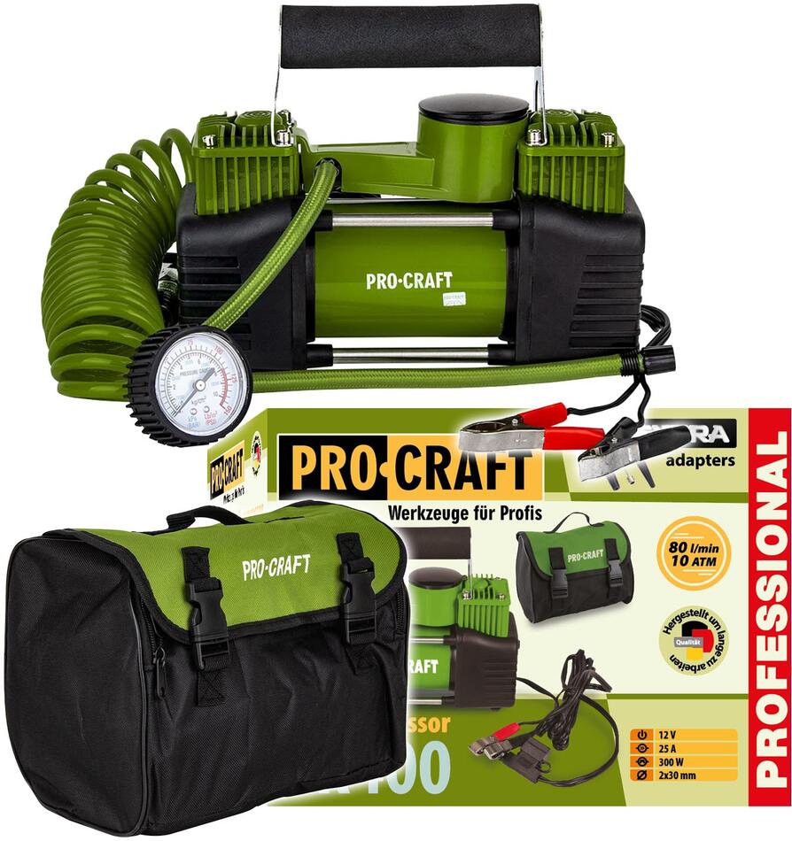 Kompresor Procraft LK400 je určen k huštění pneumatik automobilů, motocyklů, vozíků a kamionů. Silný motor s výkonem 276W zaručuje dlouhou bezporuchovou práci. Dva písty umožňuje huštění pneumatik kamionů. Napájení přímo z autobaterie. Gumové nožičky tlumí vibrace a hluk. Součástí dodávky jsou 3 koncovky a přepravní kufr. Balení karton.