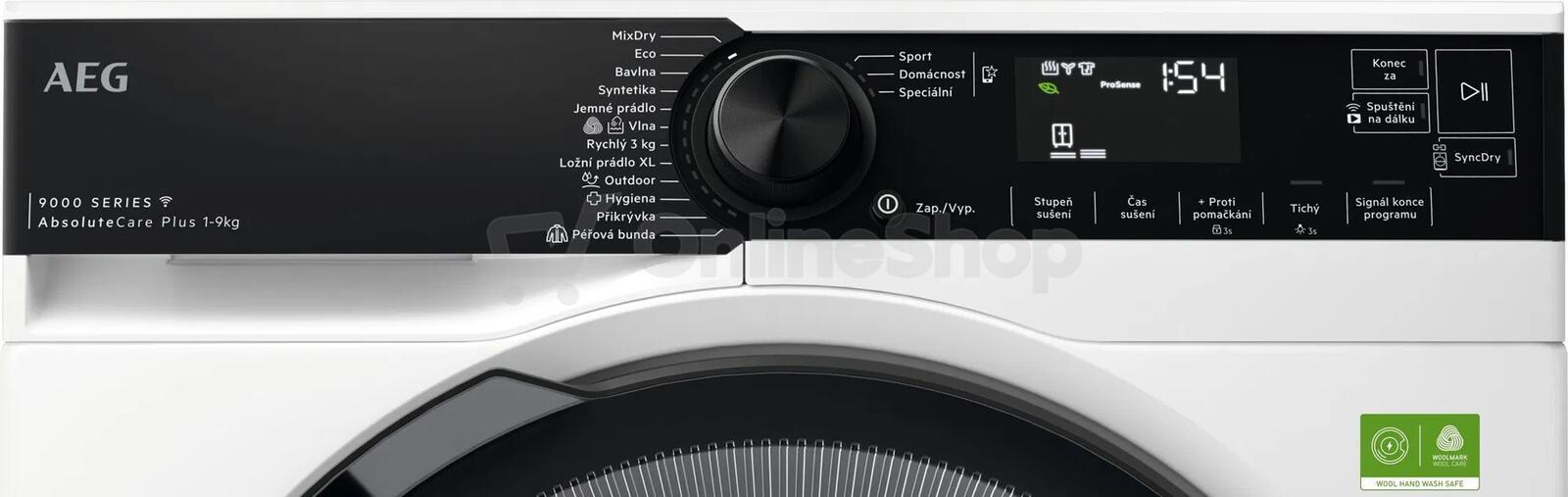 Sušička prádla; AEG 9000 AbsoluteCare® Plus 3DScan TR9396CC; Hlavní technologie: AbsoluteCare® Plus 3DScan; Konektivita: Ano; En. třída: B; Kapacita sušení (kg): 9; Způsob sušení: Tepelné čerpadlo; Hlučnost (db): 61; Vnitřní osvětlení bubnu: Ano; Parní programy: Ne; Time Manager/úspora času: Ano; Outdoor program: Ano; Programy pro vlnu a hedvábí: Ano; Woolmark: Woolmark Green ; Rozměry VxŠxHxH max. (mm): 850x596x636x657; Motor: Invertor motor se zárukou 10 let; Displej: A.3 / Dark Grey / Black Turbine Door; Standardní vybavení: Odpadní sada pro odvod kondenzátu; hřeben na čištění kondenzátoru; 5 let záruka na celý model: Ne; Spotřeba energie kWh/100cyklů: 92; Český panel a popisky: Ano;