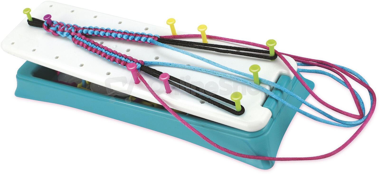 Kreativní sada obsahuje pletací stav, příze, spojovací knoflíčky a samolepky. Děti si mohou uplést 12 náramků a vybrat si mohou ze 7 stylů uzlů.
