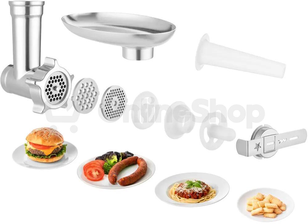 • Příslušenství: 2 nerezové mísy, mixér, mlýnek na maso, nástavec na klobásy, formovač kebabu, tvořítko na cukroví