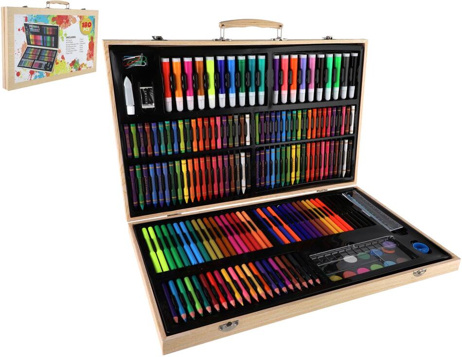 Skvělý dárek pro malé i větší umělce! Tato bohatá kreativní sada obsahuje vše potřebné pro malování, kreslení a tvoření – celkem 180 dílů přehledně uspořádaných v elegantním dřevěném kufříku se zavíráním. Ideální pro domácí tvoření, školní projekty nebo jako výtvarný set na cesty.