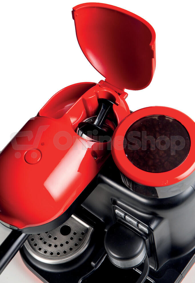 Kávovar: pákový, tlak 15 bar, objem nádržky na vodu 0,8 l, příkon 1 080 W, cappuccino a latte, mlýnek, příprava dvou šálků najednou, odkapávací systém, automatické vypnutí, červená..