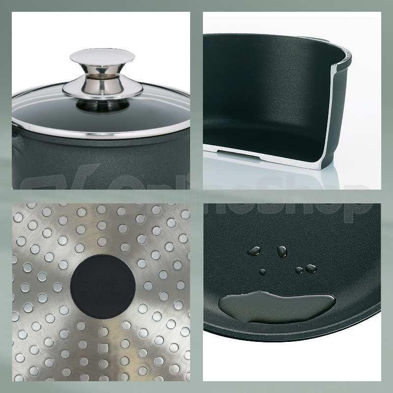 Kerros série je vyrobena ze silného litého hliníku s tloušťkou stěny 5 mm. Zvláštní znak kvality: 6 hvězdičkový nepřilnavý povrch GREBLON-C3+. 3-vrstvá, keramikou plněná teflonová vrstva se vyznačuje vynikající anti-adhezním efektem, vysokou odolností proti poškrábání a velmi dobrou odolností proti oděru.