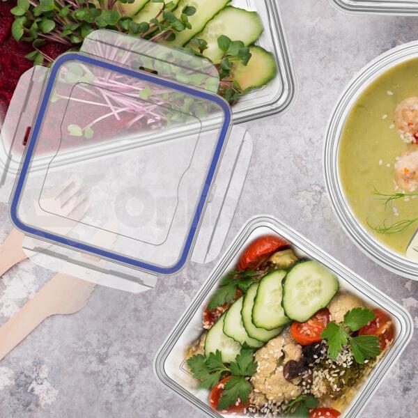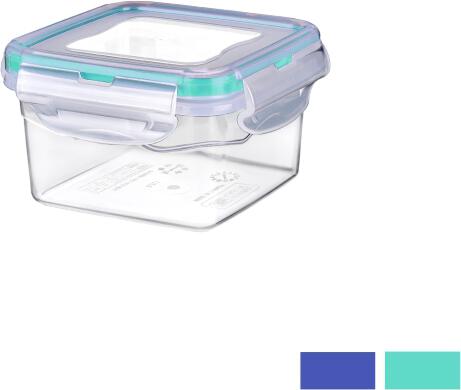 Dóza plastová hranatá transparentní se silikonovým těsněním ve víčku a klipy pro pevné uzavření. Stohovatelná. Vhodná do chladničky, MVT (bez víčka) i myčky na nádobí. Materiál: plast, silikon. Rozměry: objem 0,3 l, 10x10x6 cm.