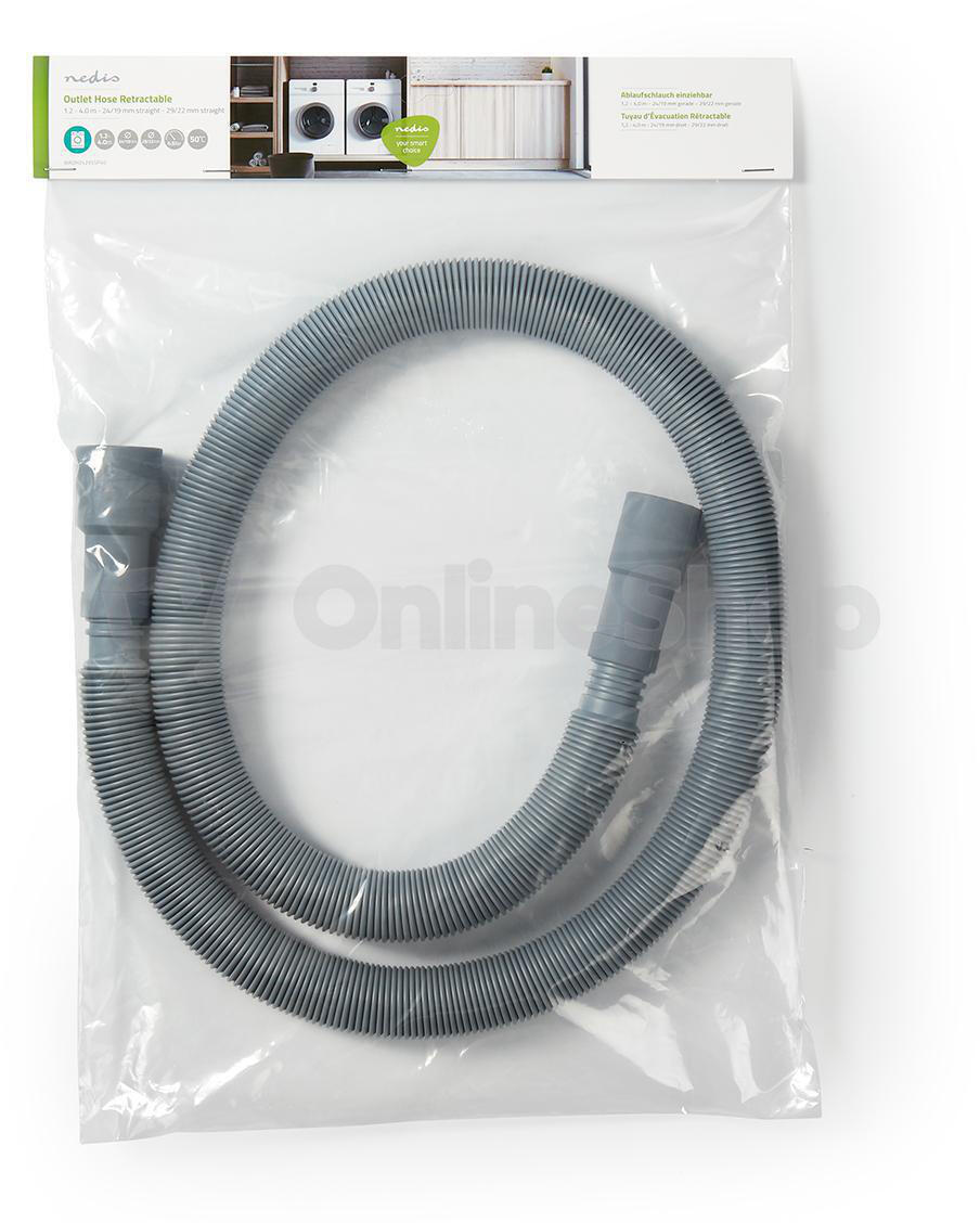 Outlet hose for dishwashers and washing machines. It is corrugated, which makes it adjustable in length, flexible and adaptable to every type of installation. The hose has a 24/19-mm and a 29/22-mm straight connection.