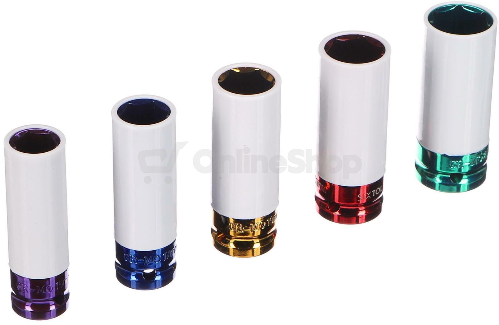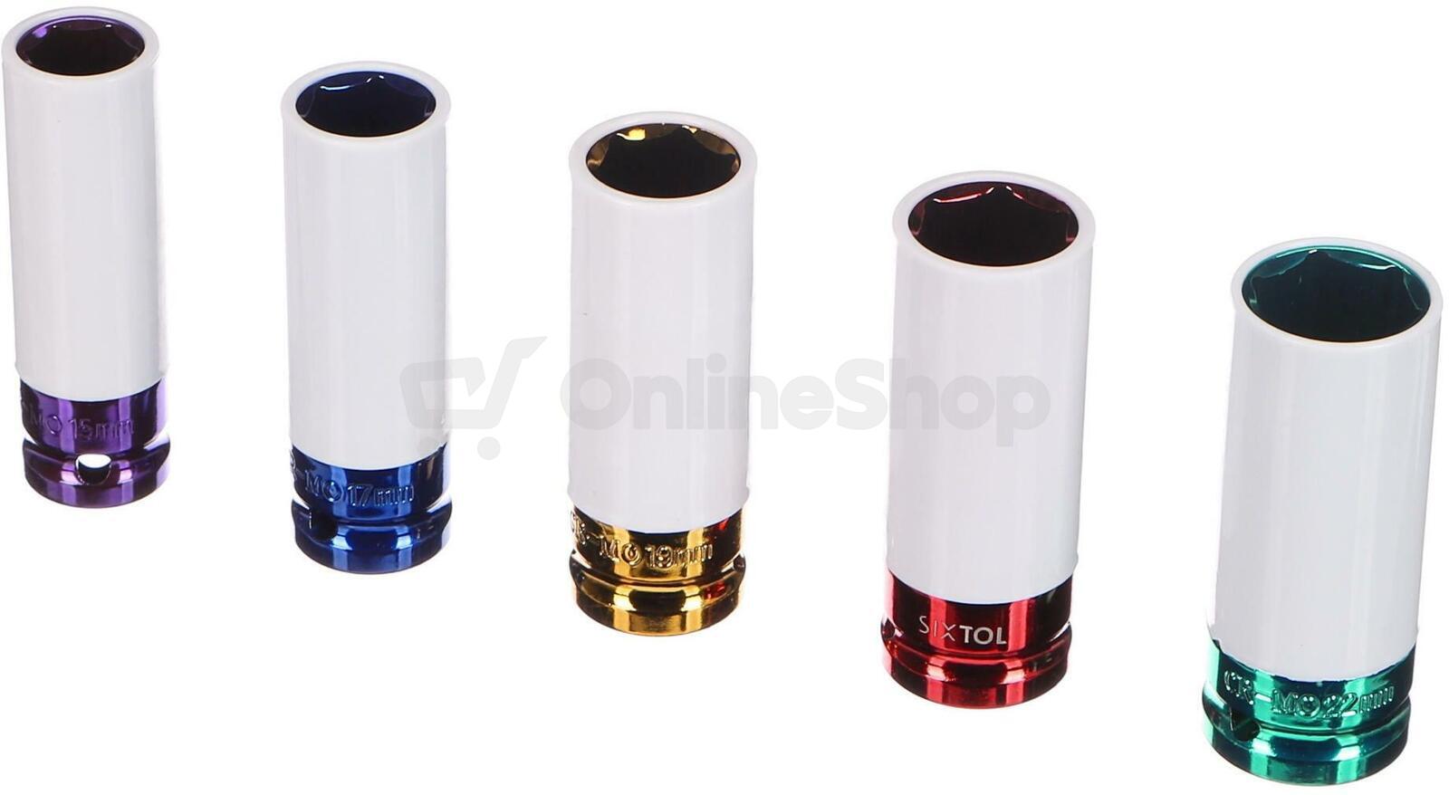 Sada SIXTOL MECHANIC IMPACT 3 obsahuje pět vysoce odolných rázových hlavic vyrobených z chrom-molybdenové oceli (CrMo), která zajišťuje extrémní pevnost a dlouhou životnost. Každá hlavice má plastový ochranný povlak, který zabraňuje poškrábání ráfků při práci. Díky barevnému odlišení jednotlivých velikostí je sada přehledná a usnadňuje rychlou identifikaci hlavic mezi velikostmi 15, 17, 19, 21 a 22 mm. Hlavice jsou vhodné pro pneumatické a elektrické rázové utahováky s uchycením 1/2".