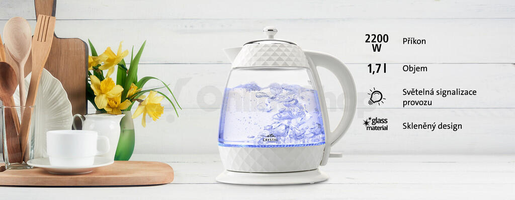 Rychlovarná konvice - skleněná, objem 1,7 l, příkon 2 200 W, bílá..