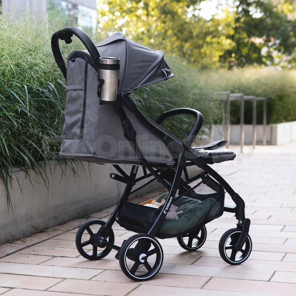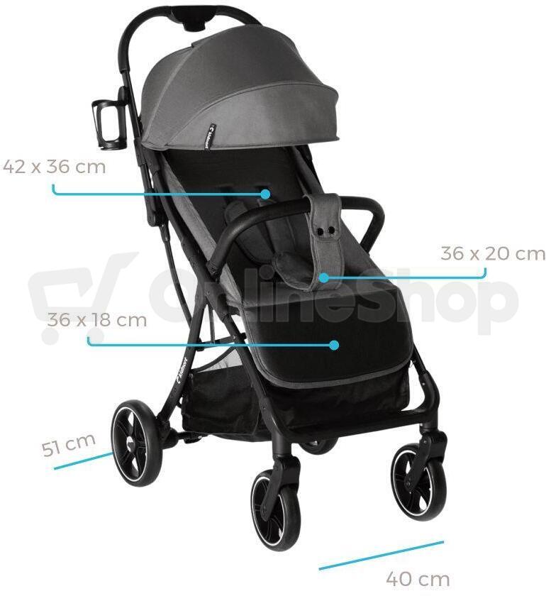 Snadné rozložení a složení kočárku pomocí jedné ruky a jednoho tlačítka. Ve složeném stavu lze skladovat vertikálně. Pro pohodlí rodičů je na zadní straně zádové opěrky kapsa, košík pod kočárkem a držák na pití.