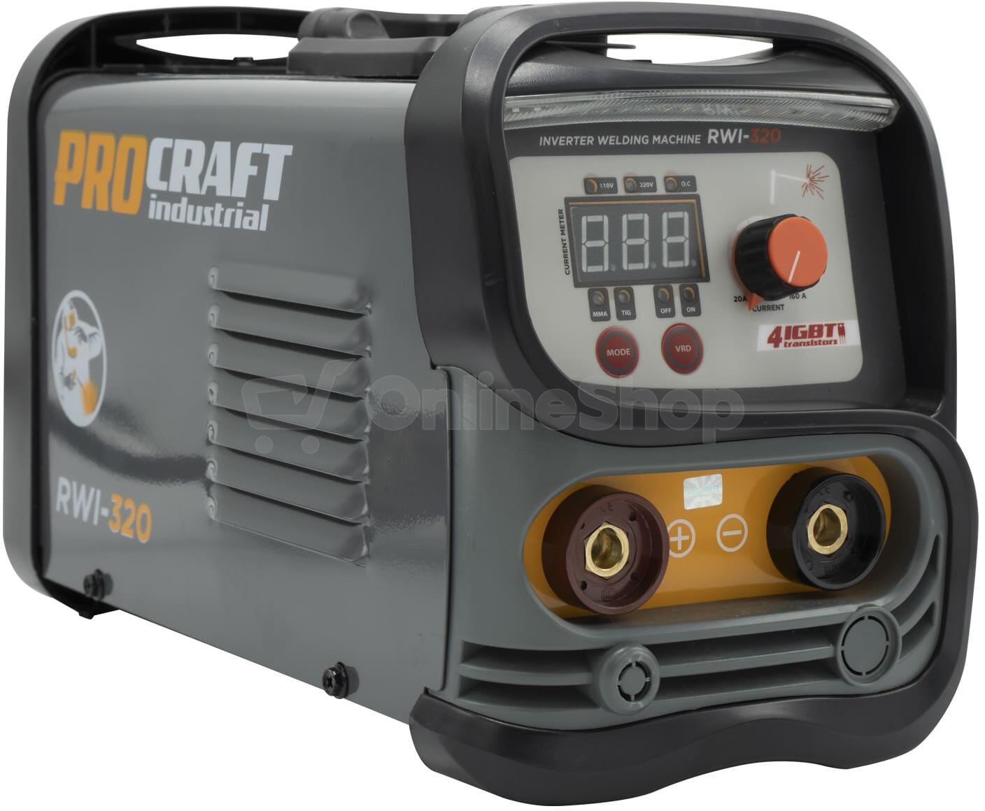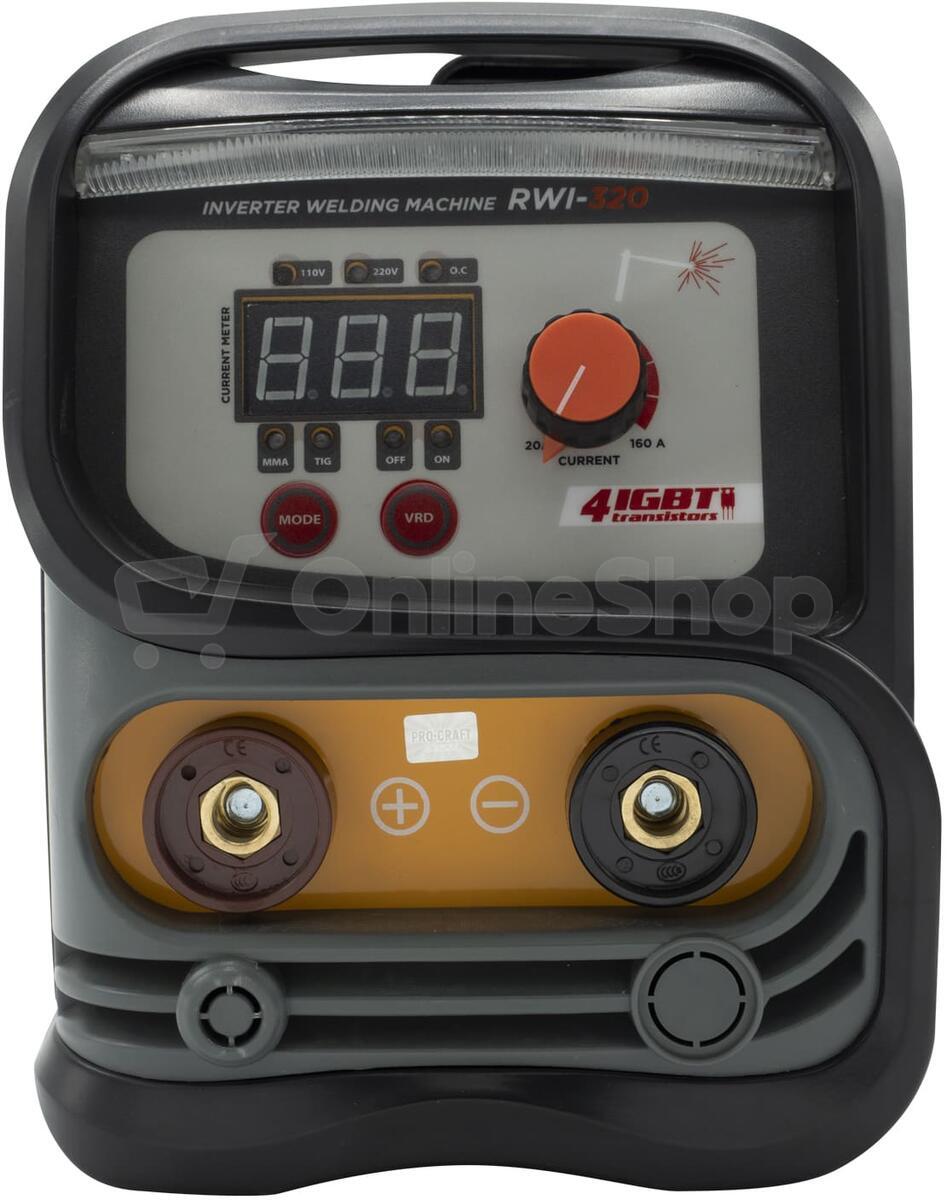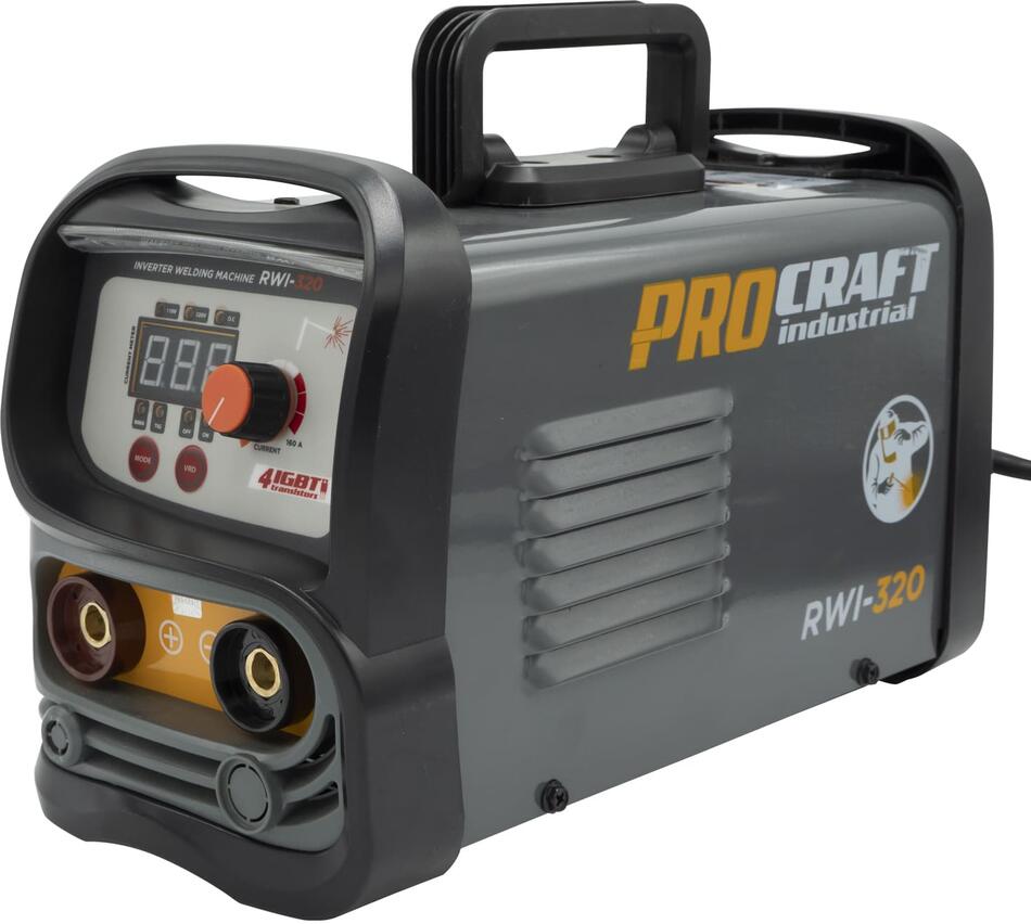 Svářecí invertor Procraft RWI-320 je určen k ručnímu svařování metodou MMA. Výkonové tranzistory IGBT zaručují dlouhou bezporuchovou práci. Regulace svařovacího proudu v rozsahu 20-160 A umožňuje nastavení optimálních parametrů při práci s různými kovy. Lze použit svařovací elektrody s průměrem 1,6 až 4,0 mm. Funkce arc force, anti stick, hot start zaručují rychlé a snadné svařování. Pomocí LCD Displeje je zobrazován aktuální svařovací proud. Součástí dodávky je svářečský štít, kabel s držákem elektrod, kabel se zemnícími kleštěmi a drátěný kartáč kombinovaný s kladivem na strusku. Balení karton.