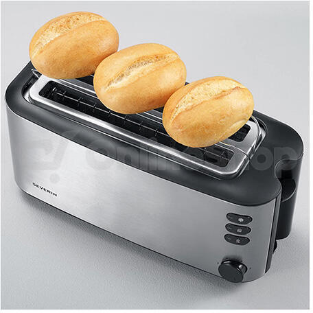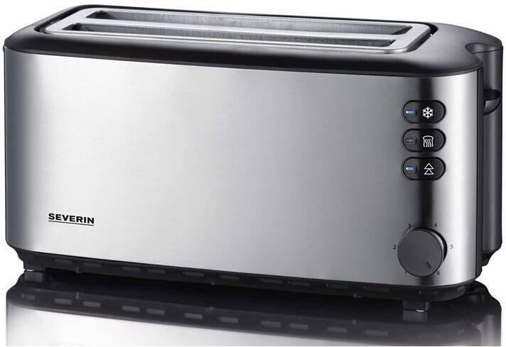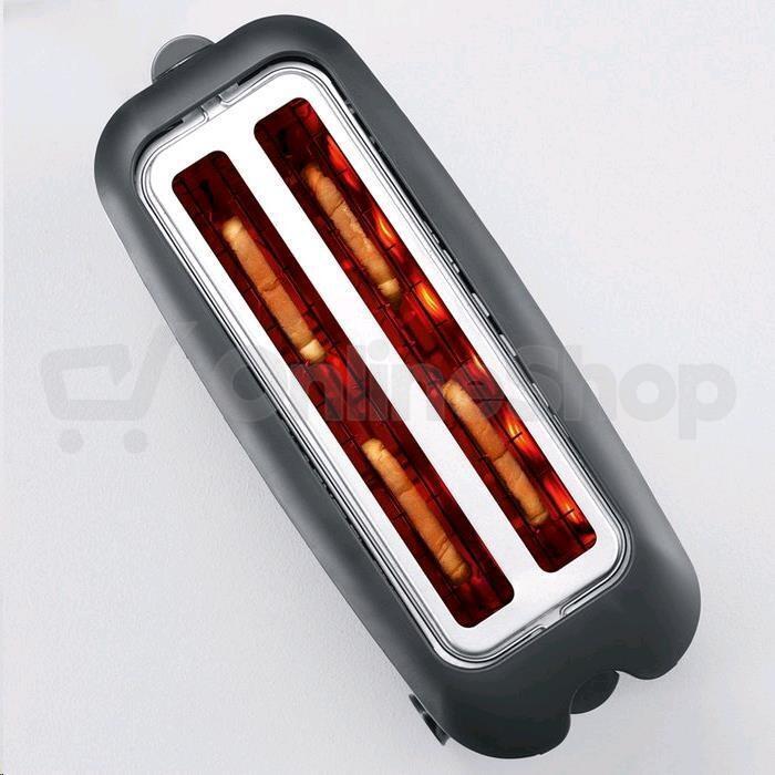 TOPINKOVAČ SE DVĚMA ŠTĚRBINAMI• broušený nerez + černá• cca 1400 W• dvojitá stěna• tepelně izolovaný nerezový kryt• vestavěný horní nahřívač housek• 2 zvláště dlouhé štěrbiny až na 4 plátky toastů• elektronický ovladač zhnědnutí s teplotním čidlem• ovladač pro nastavení zhnědnutí• tlačítko pro rozmrazování s indikátorem• tlačítko pro dohřívání (bez dalšího zhnědnutí) s indikátorem• tlačítko zrušení činnosti uprostřed cyklu včetně indikátoru• proměnlivá šířka štěrbin topinkovače pro rovnoměrné zhnědnutí•  automatické vypnutí v případě vzpříčení chleba• miska na drobky• prostor pro uložení kabelu