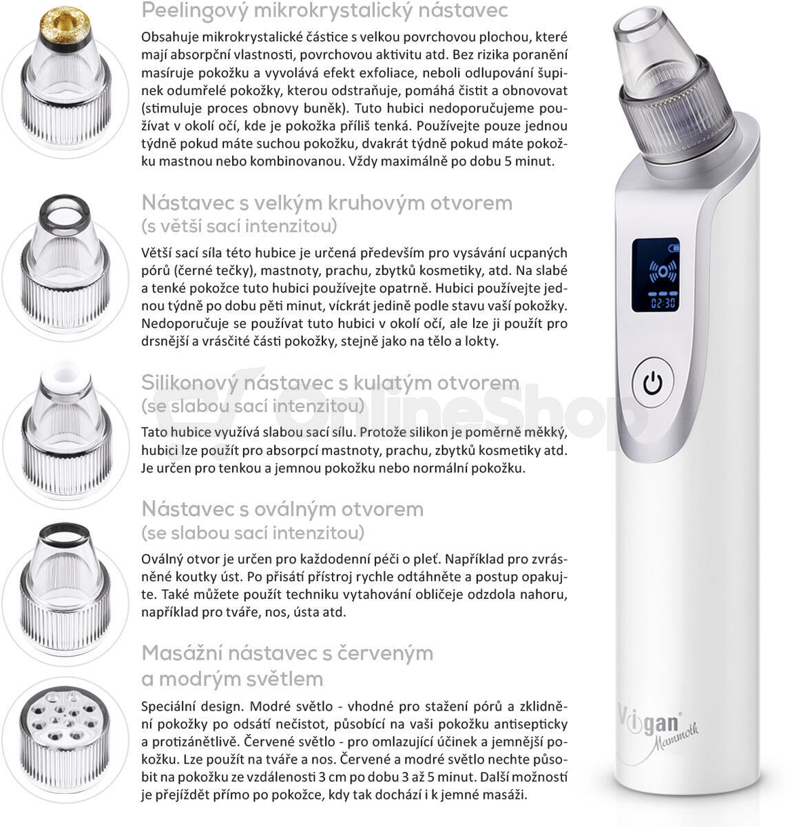 • modré světlo pro stažení pórů a zklidnění pokožky po odsátí nečistot