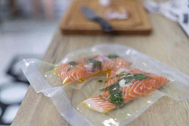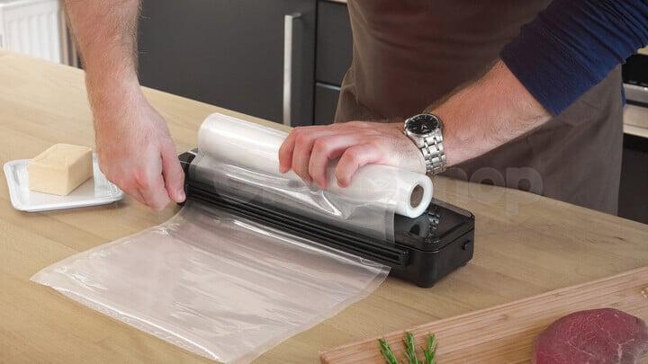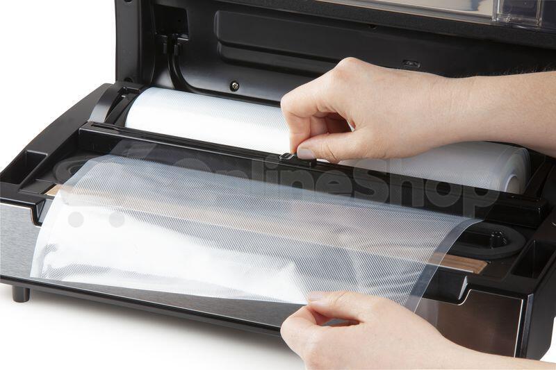 Vakuovačka potravin s integrovaným zásobníkem na roli fólie a řezačkou pro snadné uříznutí fólie na...