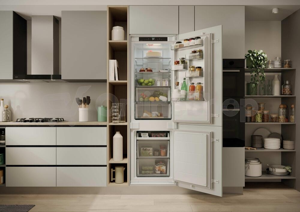 Chladnička - kombinovaná chladnička, vestavná, mrazák dole, energetická třída E, hlučnost 35 db, objem 251 l, No Frost, mrazák, Total No Frost, SuperCool, LED osvětlení, Režim ECO, změna otevíraní dveří, alarm nedovřených dveří, displej, prázdninový režim, výška 177,2 cm, šířka 54 cm, hloubka 55 cm, bílá..