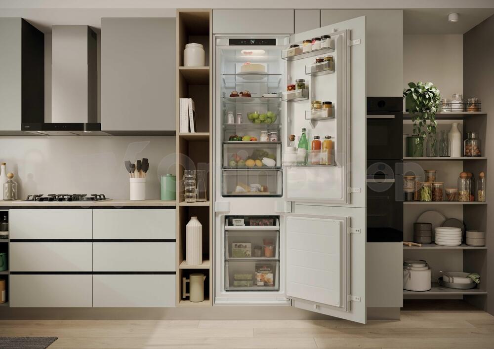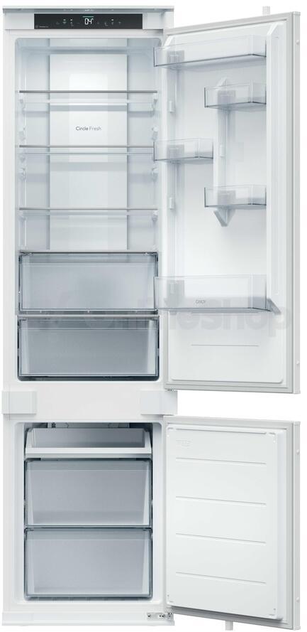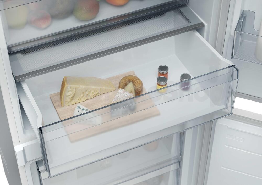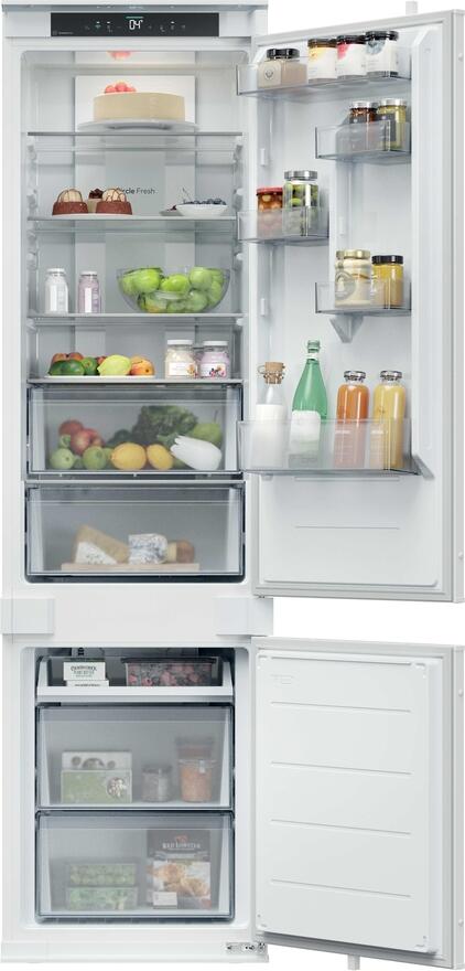Chladnička - kombinovaná chladnička, vestavná, mrazák dole, energetická třída E, hlučnost 35 db, objem 284 l, No Frost, mrazák, Total No Frost, Multi Air Flow, SuperCool, LED osvětlení, Režim ECO, změna otevíraní dveří, alarm nedovřených dveří, displej, prázdninový režim, chytrá domácnost, výška 193,5 cm, šířka 54 cm, hloubka 55 cm, bílá..