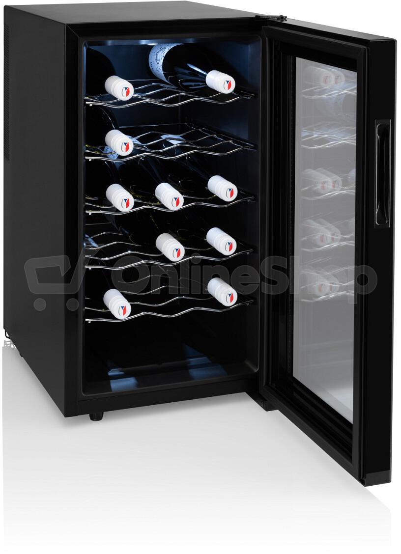 Vinotéka - energetická třída G, volně stojící, jednozónová, termoelektrická, 18 lahví, LED osvětlení, hlučnost 26 dB, výška 63,5 cm, šířka 35,5 cm, hloubka 50,2 cm, hmotnost 15,68 kg..