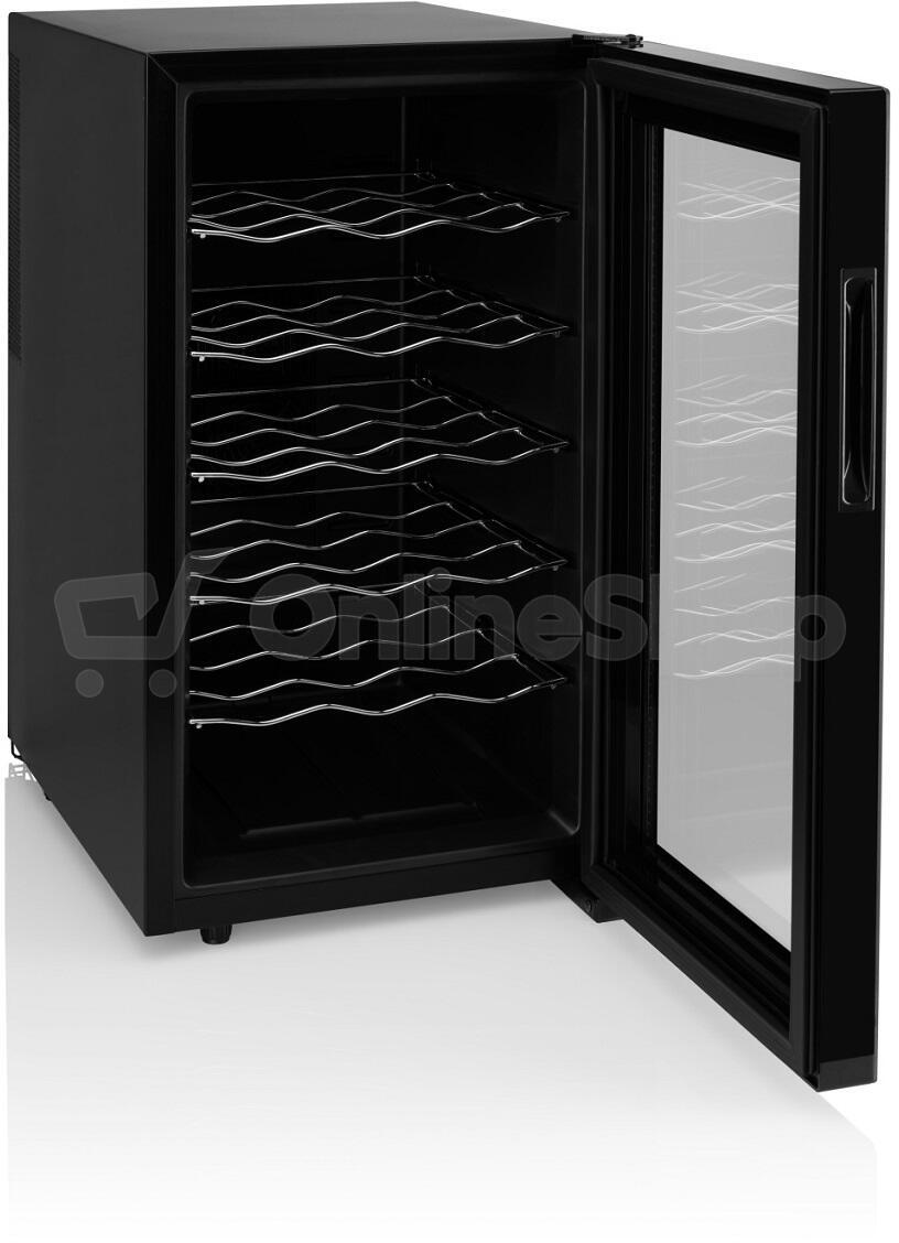 Vinotéka - energetická třída G, volně stojící, jednozónová, termoelektrická, 18 lahví, LED osvětlení, hlučnost 26 dB, výška 63,5 cm, šířka 35,5 cm, hloubka 50,2 cm, hmotnost 15,68 kg..