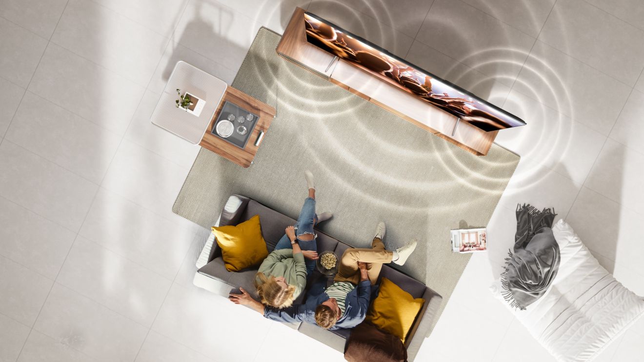 Dva reproduktory s vertikálním zvukovým výstupem po stranách soundbaru poskytují dalších 40 W silného zvuku, který se odráží od stěn.